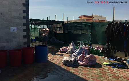 Wenngleich ein Provisorium, so gibt es doch an der Organisation an diesem Standort nichts zu meckern: alles ist da, wo und wie es sein soll: im Inneren ein großer Raum mit Spind, wo die Kleidung nach dem Umziehen gelassen werden kann, ebenso die Tauchrucksäcke; auch Duschen und Toiletten sind vorhanden. Im Außenbereich gibt es Wassertonnen zum Spülen der Ausrüstung, und hinreichend Möglichkeiten zum Aufhängen der Anzüge und der Jackets.