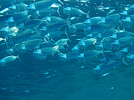 Und noch ganz benommen von diesem Schauspiel wartet schon das nächste auf uns: Eine Schule Großmaulmakrelen kommt auf uns zu die Mäuler weit offen pflügen sie synchron durchs Wasser und glitzern silbrig, während sie knapp unter der Wasseroberfläche auf Frühstücksjagd sind. Sie lassen sich auch nicht beirren, als wir direkt in sie hineintauchen: Dicht schwimmen sie im Kreis um uns herum und ziehen dann weiter. |