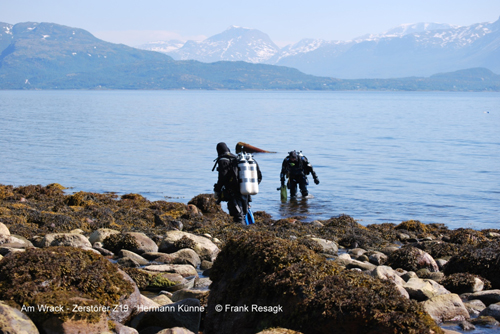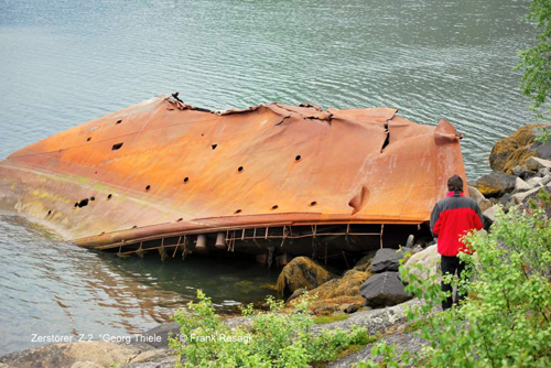 Wir bereiten uns auf die TG’s im Hafen von Narvik vor. In den nächsten Tagen betauchten wir die dt. Zerstörer „Anton Schmitt u. Wilhelm Heidkamp“, die Erzfrachter „Stråssa“ und „Martha Hendrik Fisser“. Der Abschluss der Narviktauchtage war Tauchen im Rombaksbotn. Im „Tal des Todes“, so benannt nach der Versenkung von 4 dt. Zerstörern (Georg Thiele,Wolfgang Zenker, Bernd v.Arnim und Hans Lüdemann), die aufgrund Munitionsmangels keinen Ausweg sahen, durch die Besatzung ihre Schiffe aufzugeben, auf Grund zu setzen und zu sprengen. Georg Thiele liegt mit dem Bug am Land und ist heute als Mahnmal an diesen unsinnigen Krieg geblieben. An diesen Wracks herrscht Tauchverbot.